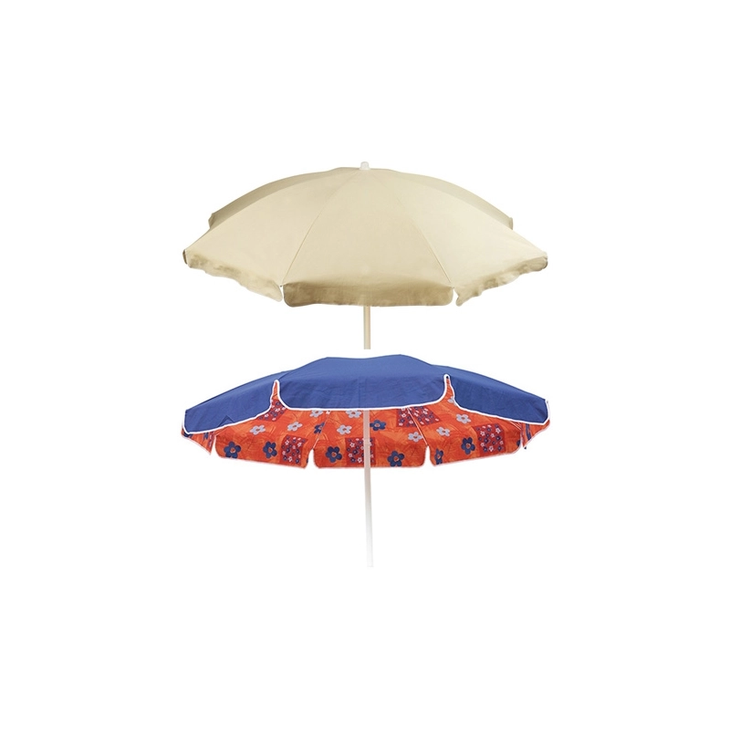Ombrellone rotondo diametro 2 mt, con fusto centrale di diametro 33 mm con snodo e bloccaggio. Copertura in cotone. 8 bacchette. Made in Italy. Il color ecru e' tinta unita mentre tutti gli altri hanno l'esterno tinta unita e l'interno in fantasie assortite. Modello = colore esterno/copertura gr/mq