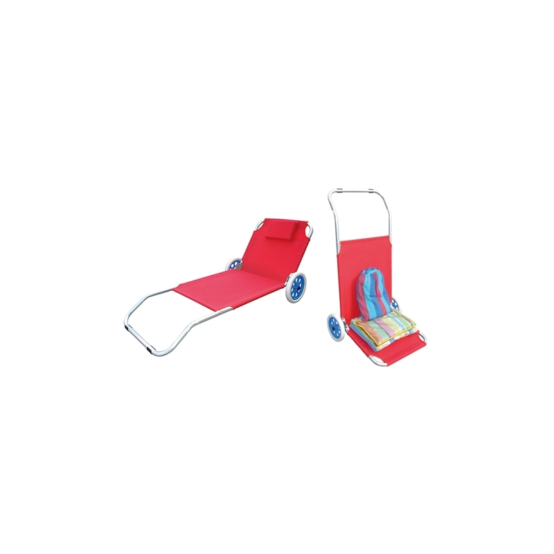 Spiaggina pieghevole con ruote, utilizzabile come trolley. Struttura in tubo d'acciaio diametro 25 mm. Tessuto 600D/PVC. Colori assortiti. Dimensioni 150x66x90 cm.
