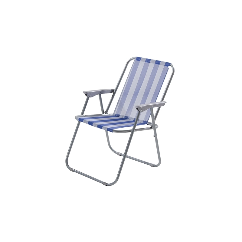 Sedia pieghevole da spiaggia con struttura in acciaio di diametro 18 mm e seduta a strisce bianco/blu in textilene 1x1. Poggiabraccio in plastica. Dimensioni 52x44x75 cm.