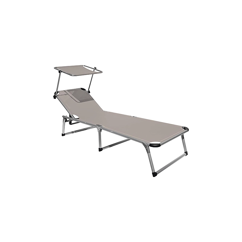 Lettino pieghevole con parasole. Struttura in tubo di alluminio diametro 28 mm e telo in textilene 600 gr. Piedini antiscivolo, angoli antiurto, schienale reclinabile. Adatto per esterni. Dimensioni 193x59x30 cm. Colore tortora
