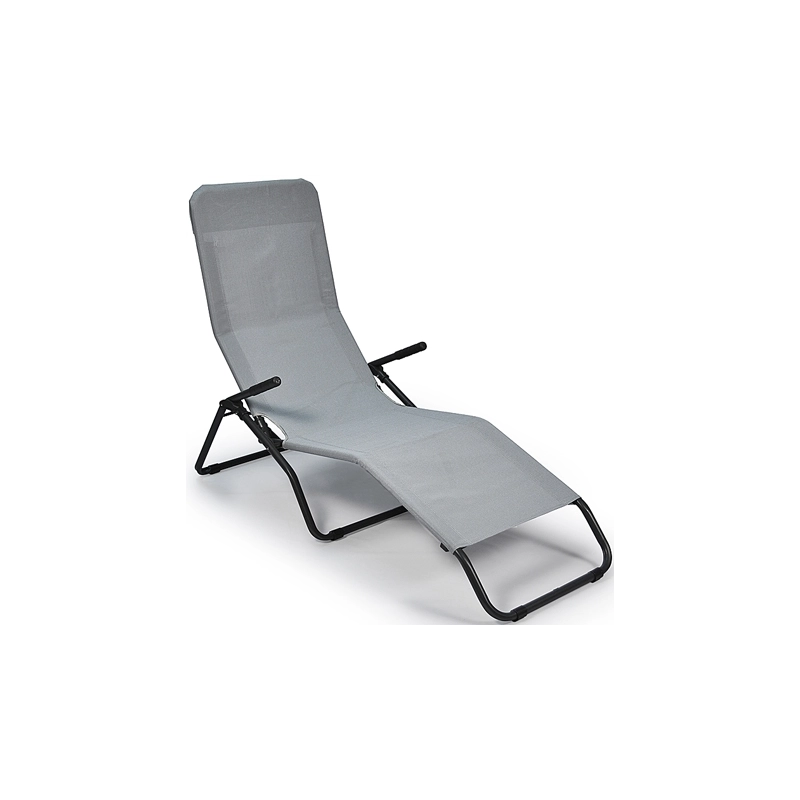 Lettino basculante, struttura in tubo d'acciaio diametro 25 mm colore scuro, telo in textilene colori assortiti grigio/beige. Schienale regolabile in 2 posizioni. Adatto per esterni. Dimensioni 170x65x101h cm. Made in Italy