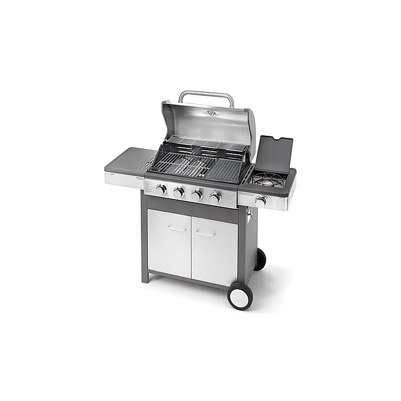 Barbecue con camera di combustione in acciaio smaltato, coperchio completo di termometro, mensole laterali, pannello di controllo e porte armadietto in acciaio inox. Griglia riscalda vivande in acciaio inox da 62x12 cm. 4 bruciatori in acciaio inox a una rampa con sopra tegolino fragifiamma (4x3,6 kW). Fornello laterale con bruciatore inox. Accensione elettronica. Dimensioni 58x133x115,5 h cm.