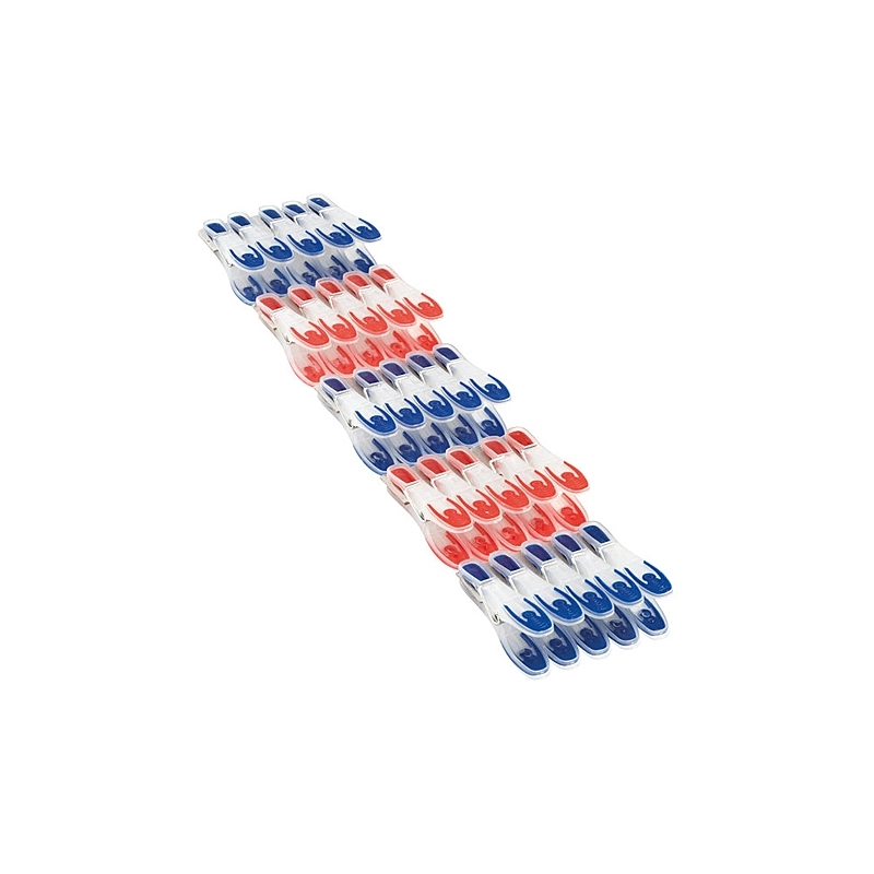 Confezione da 25 mollette fornite in 2 colori (15 blu e 10 rosse). Mollette in materiale plastico bicomponente con interno pinza morbido.
