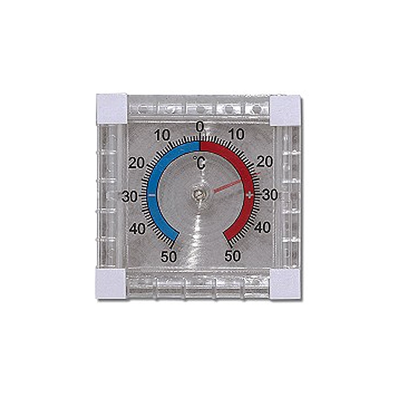 Termometro da finestra in plastica. Si puo' attaccare al vetro esterno tramite i 4 angoli adesivi. Dimensioni 75x75 mm. Peso 25 gr.