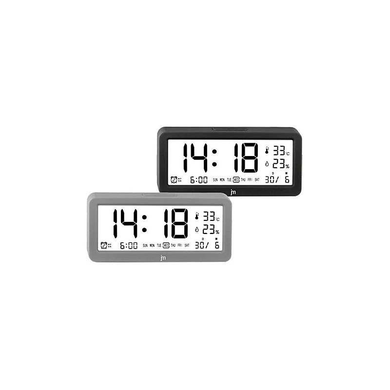 Sveglia con allarme. Visualizzazione dell'orario, della temperatura interna (C) ed umidita'. Funzione calendario. Luce elettroluminescente bianca. Triplo allarme diversificabile in base al giorno della settimana. Dimensioni 14,5x7x3,5 cm. Colori grigio o nero.