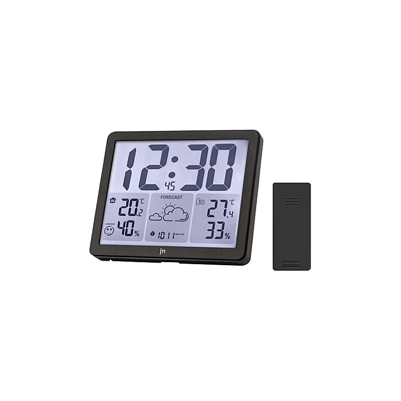 Stazione barometrica radiocontrollata con funzione radio controllo attivabile e disattivabile. Indicazione delle condizioni meteorologiche nell'arco delle 12/24h tramite apposite icone. Rilevazione della pressione atmosferica. Con sonda radio esterna. Funzione sveglia con doppio allarme e snooze (regolazione 1-30 minuti). Dimensioni 17x14x3,5 cm.