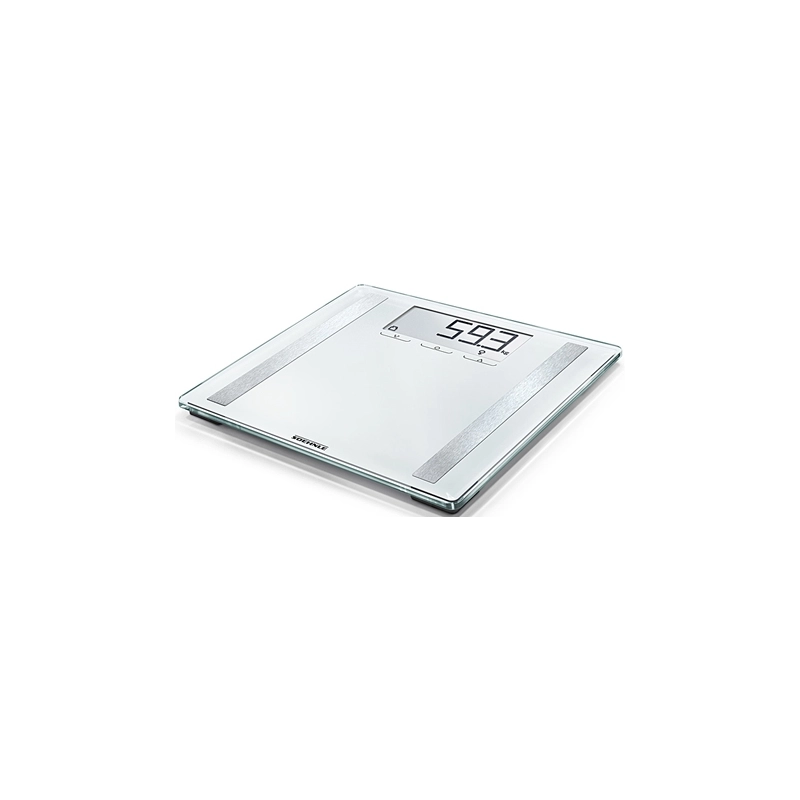Ampia pedana in vetro (spessore 8 mm). Con display LCD e spegnimento automatico. Portata max kg 180. Precisione pesata gr 100. Calcolo della percentuale di grasso, acqua e massa muscolare, oltre al fabbisogno giornaliero di calorie (kcal). Batterie in dotazione. Con piedini antiscivolo. Colore bianco. Dimensioni 32x32x2,1h cm.