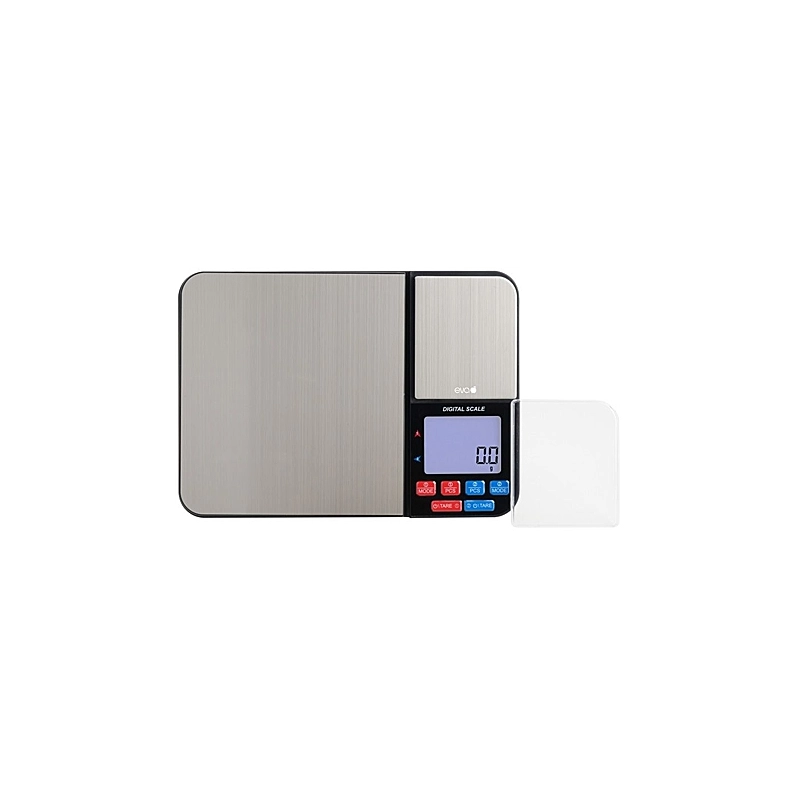 Bilancia da cucina con 2 piattaforme di pesature. Piattaforma grande portata 5 kg, divisione fine 1 gr. Piattaforma piccola portata 500 gr, divisione fine 0,01 gr. Superficie di pesata in acciaio inox. Display LCD. Fornita con 3 batterie AAA da 1,5V. Dimensioni 19,5x14x2,9 cm