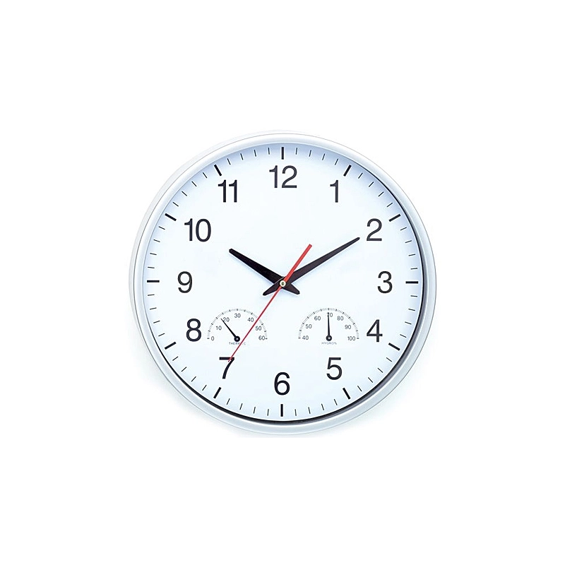 Orologio da parete con termometro e igrometro. Struttura in PP. Movimento al quarzo. Diametro 35 cm. Spessore 4,1 cm. Peso 0,92 kg.
