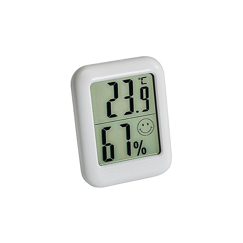 Termometro digitale con igrometro. Funziona con 1 batteria AAA. Dimensioni 80x60x20 mm