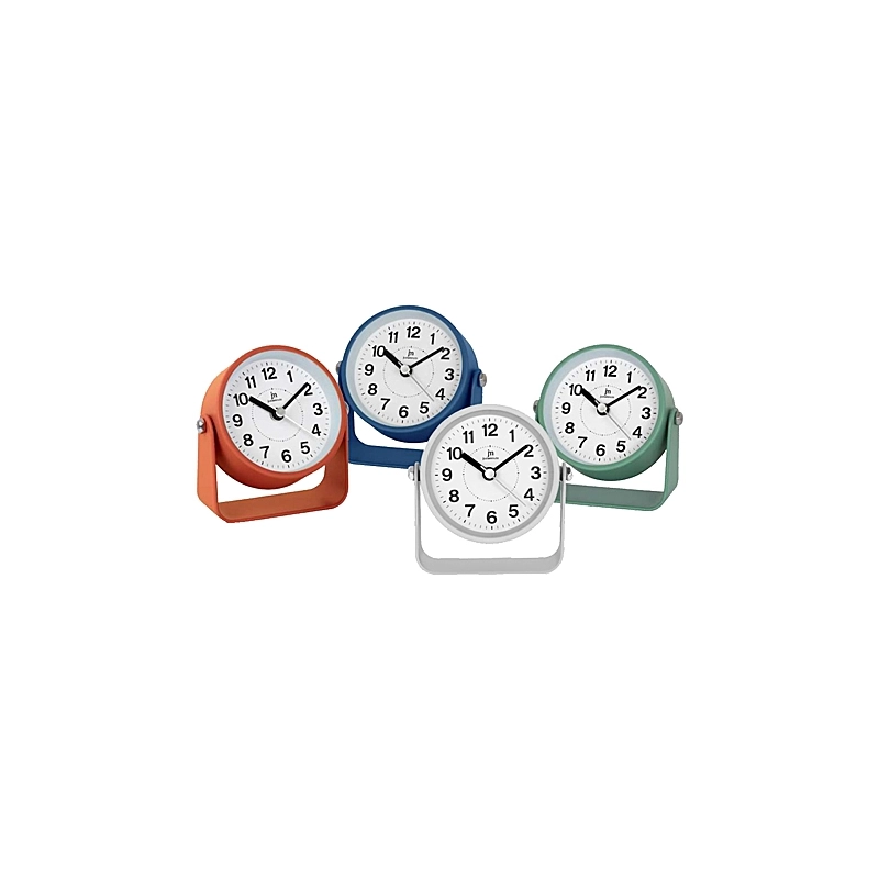 Sveglia tonda in metallo. Movimento continuo silenzioso. Funzione snooze (ripetizione dopo 5 minuti). Dimensioni 10x10x4 cm. Colori assortiti.