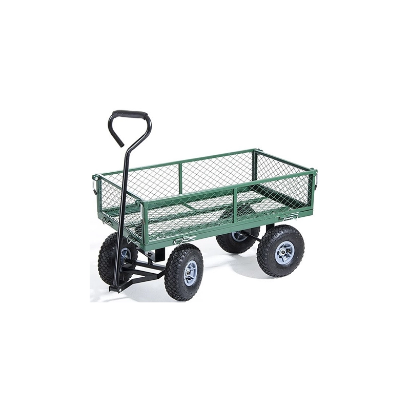 Carrello con pianale e 4 ruote diam. mm.260, 2 fisse e 2 sterzanti tramite l'impugnatura. Portata kg 150. Dimensione pianale mm 500 x 900. Ruote con perno disassato con foro da 16 mm su cuscinetti a sfera.