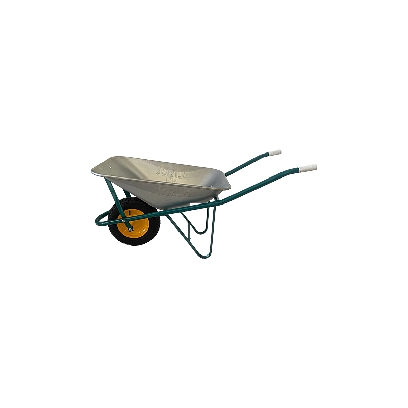Telaio tubolare verniciato. Con vasca smontata zincata. Manopole in polietilene antiscivolo. Ruota pneumatica mm 350x8. Spessore vasca 8/10. Volume l 75.