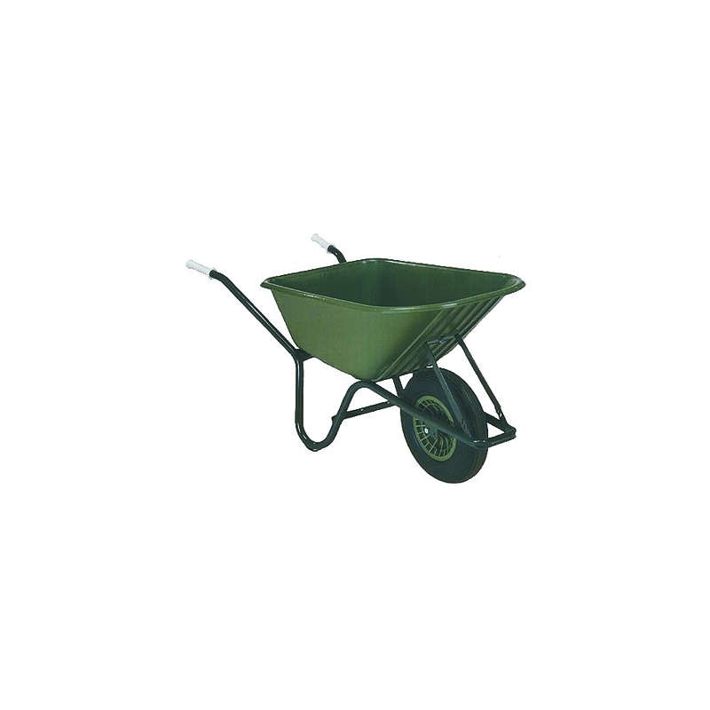 Carriola con vasca in polipropilene.Telaio tubolare in acciaio verniciato con diametro mm 30. Ruota mm 400x100 su cuscinetti. Volume l 100. Fornita smontata. Modello = tipo ruota