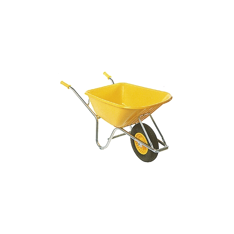 Carriola con vasca in polietilene super resistente al taglio ed all'abrasione, adatto per edilizia. Telaio tubolare in acciaio zincato, rinforzato. Ruota mm 400x100 con camera d'aria pneumatico rinforzato a 4 tele e mozzo su cuscinetti. Volume l 100