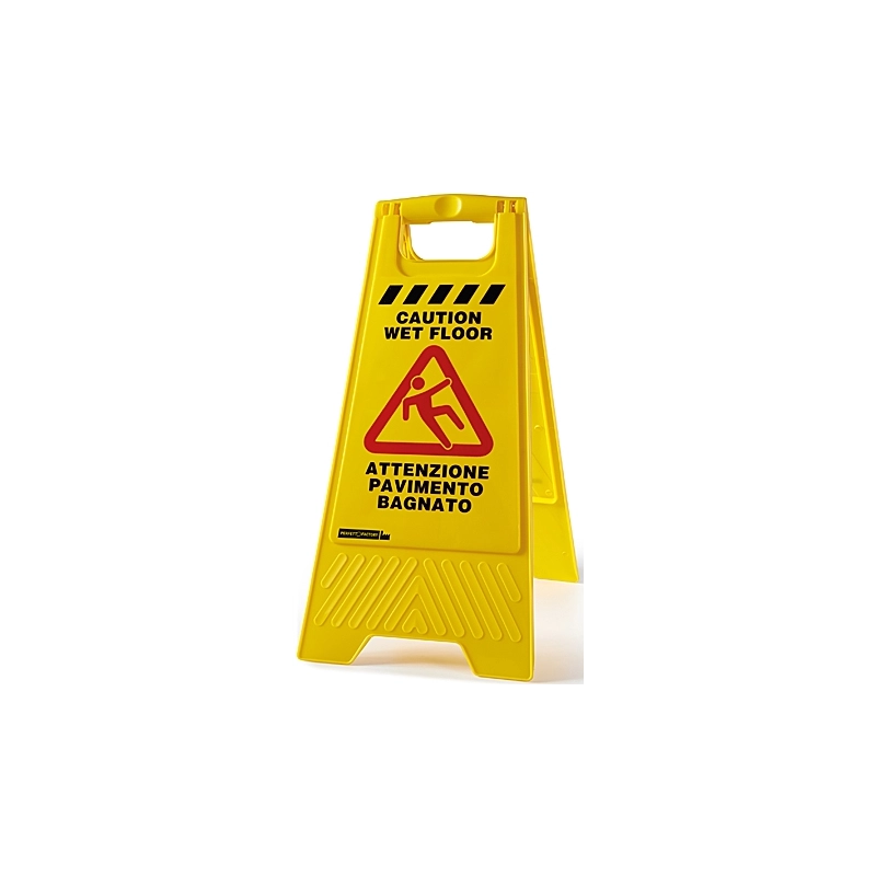 Segnale antinfortunistico di pavimenti bagnati scivolosi. Prodotto interamente in plastica gialla ben visibile. Altezza cm 57.