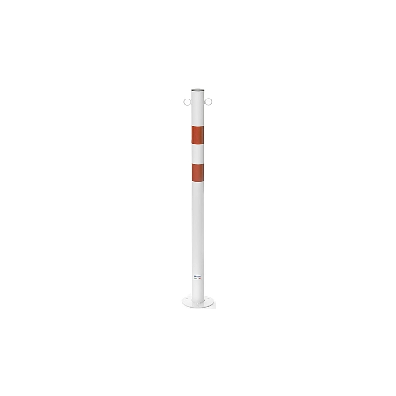 Paletto in acciaio verniciato a polvere bianco con tappo superiore in pvc nero. Con strisce rosse catarinfrangenti con anelli porta catena. Con piastra di base per tassellarlo a terra diametro 12 cm. Tubo di diametro 6 cm e altezza 100 cm.