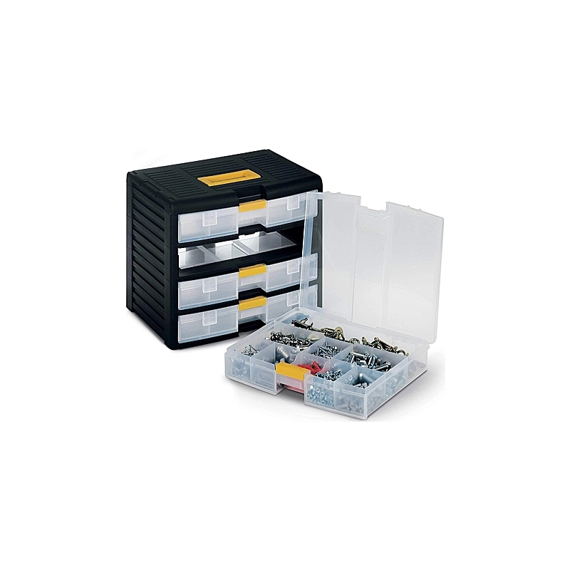 Cassettiera modulare trasportabile, con maniglia ergonomica a scomparsa. Con 4 cassetti dotati di coperchio e chiusura brevettata. Dimensioni (L x P x H) mm. 391 x 290 x 334