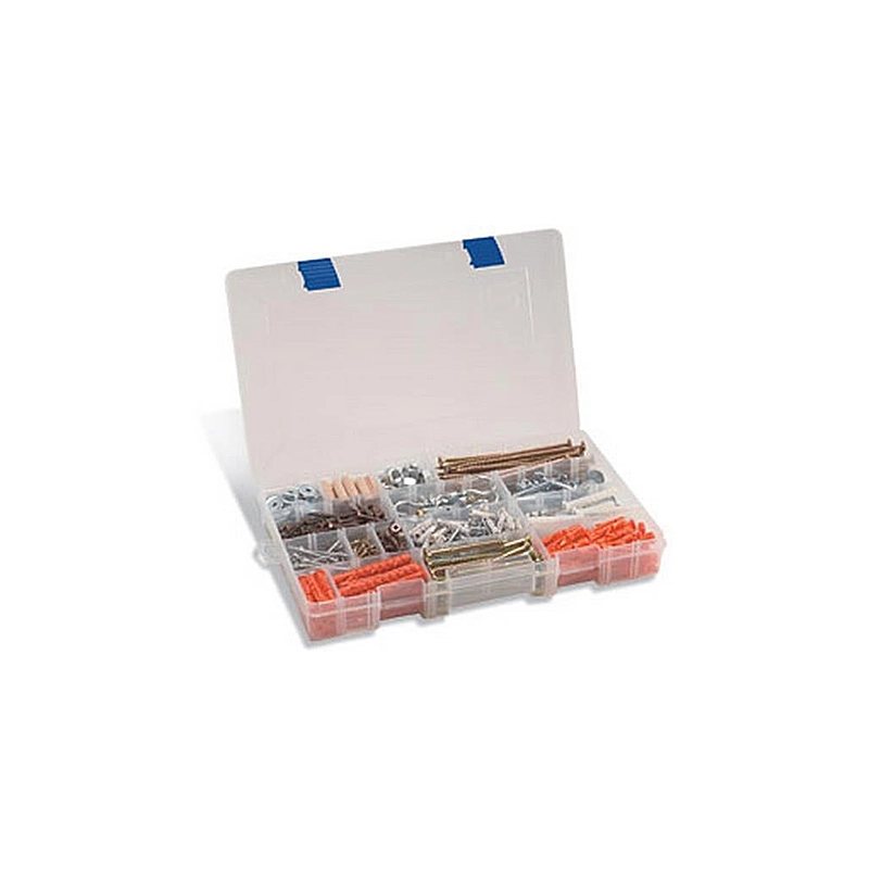 In polipropilene trasparente con resistenti chiusure colorate. Modello = numero scomparti modulabili/dimensioni (LxPxH) mm.