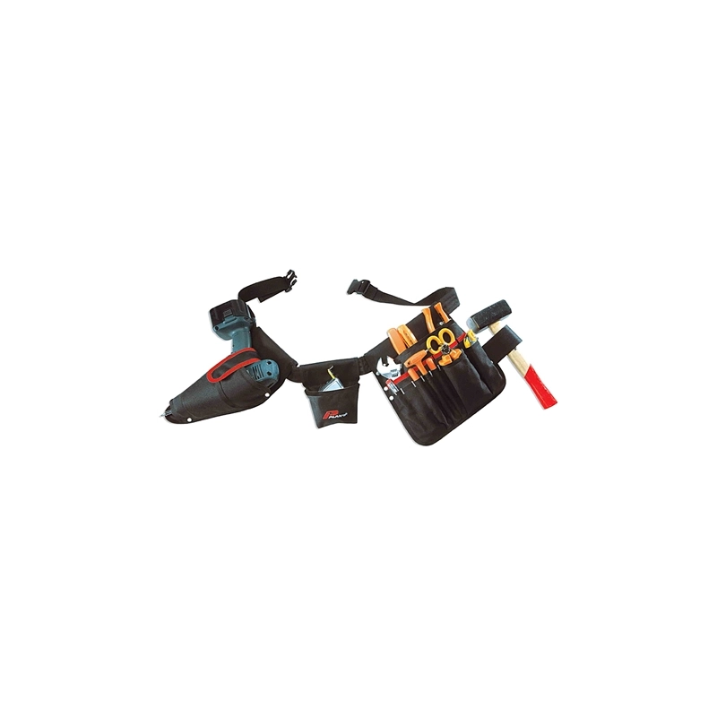Cintura con 15 tasche per utensili e minuterie con un'asola porta martello. Pratica fondina per trapani avvitatori. Ampia tasca per flessometro (fino a 7,5 mt). Cintura regolabile da 90 a 120 cm. Sganciamento rapido.