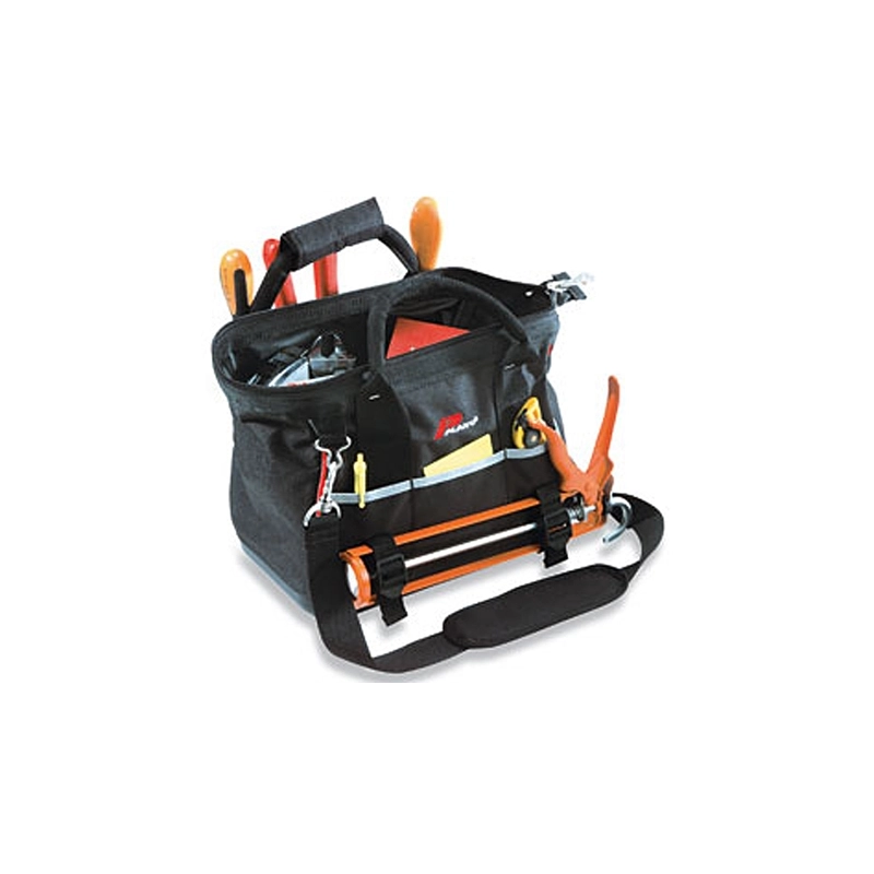 Borsa portautensili in tessuto speciale rinforzato. Fondo rigido in polietilene. Tasche interne ed esterne. Lacci esterni per attrezzi ingombranti. Cinghia a tracolla. Dimensioni 19x30x18h cm.