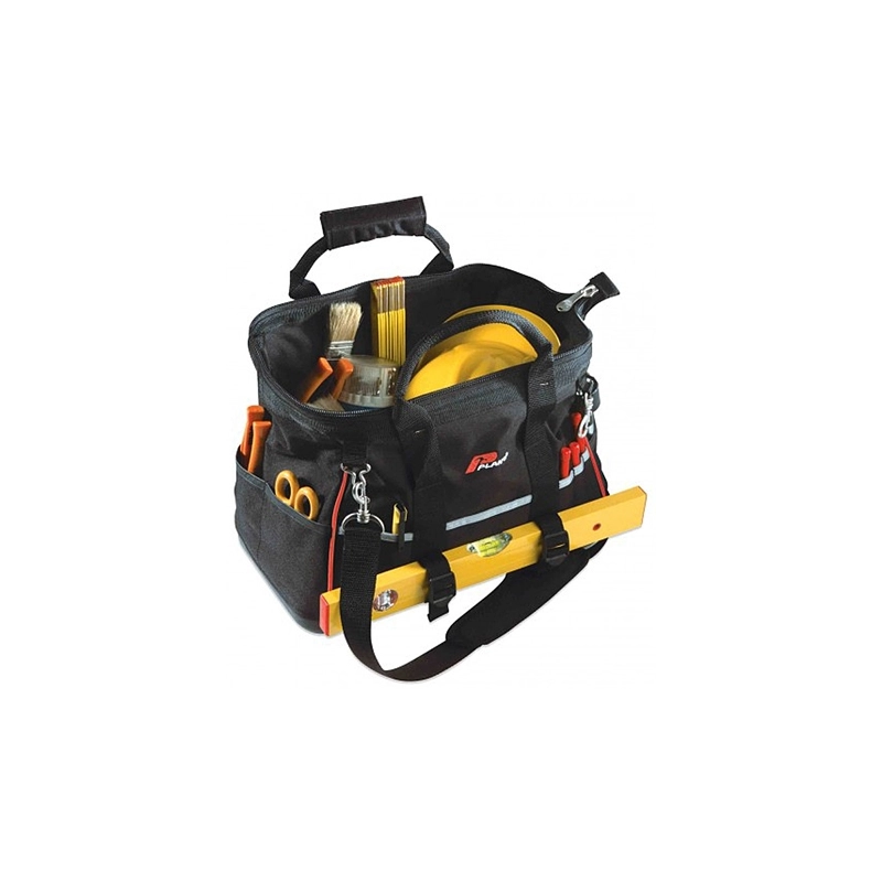 Borsa portautensili in tessuto speciale rinforzato. Fondo rigido in polietilene. Tasche interne ed esterne. Lacci esterni per attrezzi ingombranti. Cinghia a tracolla. Dimensioni 24x39x21h cm.