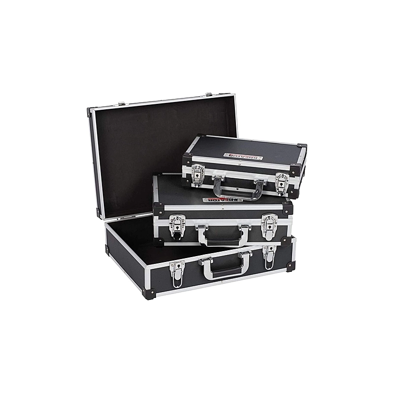 Set pz. 3 di valigie in alluminio con rinforzo angolare, cerniere in metallo e chiusura con chiave. Dimensioni (LxPxH): 330x90x210 mm, 380x120x260 mm e 460x160x330 mm