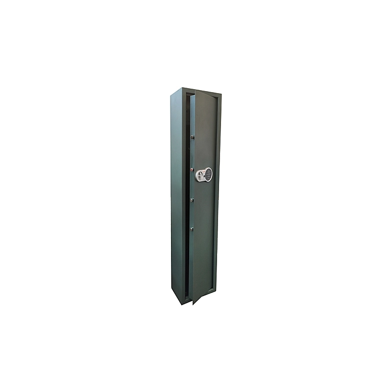Armadio portafucili. Struttura in acciaio speciale. Serratura con combinazione elettronica digitale e chiave di emergenza. Fornito con rastrelliera a 5 posti. Tesoretto interno a chiave. 4 catenacci in acciaio diametro 22 mm. Dimensioni esterne 308x208x1480 mm. Peso 36,6 kg.
