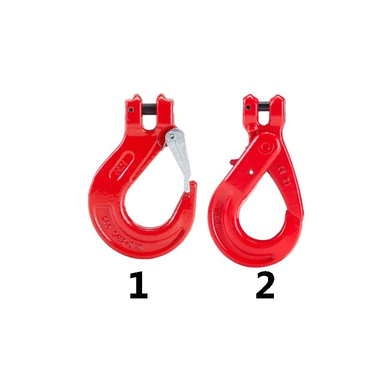 Ganci a forcella grado 80 per sollevamento. Tipo Clevis GKN con levetta a molla o tipo BKG di sicurezza con chiusura automatica. Modello = misura mm/tipo gancio/numero foto