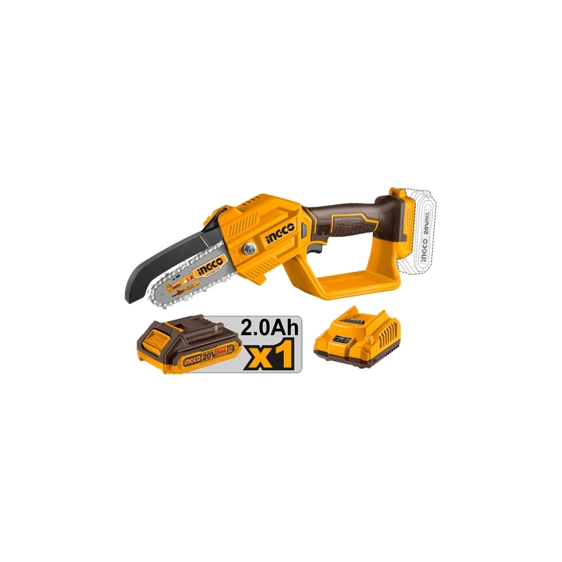 20 V. Velocita' catena a vuoto 5 m/s. Lunghezza della barra 13 cm. Con 1 batteria da 2 Ah e caricabatterie.