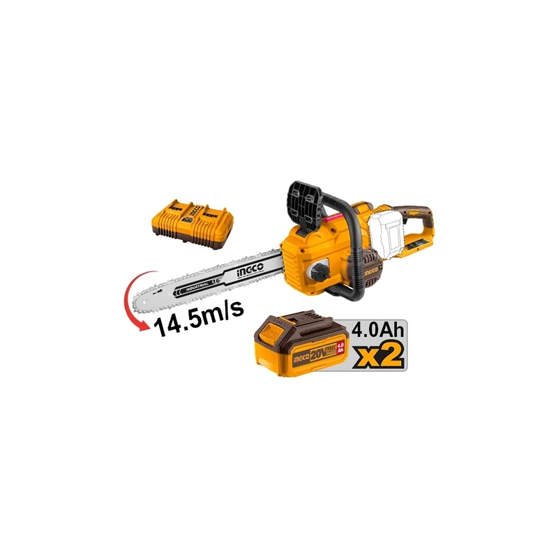 40 V (20V + 20V). Brushless. Velocita' catena a vuoto 14,5 m/s. Lunghezza della barra 40 cm. Con 2 batterie da 4 Ah e caricabatterie.