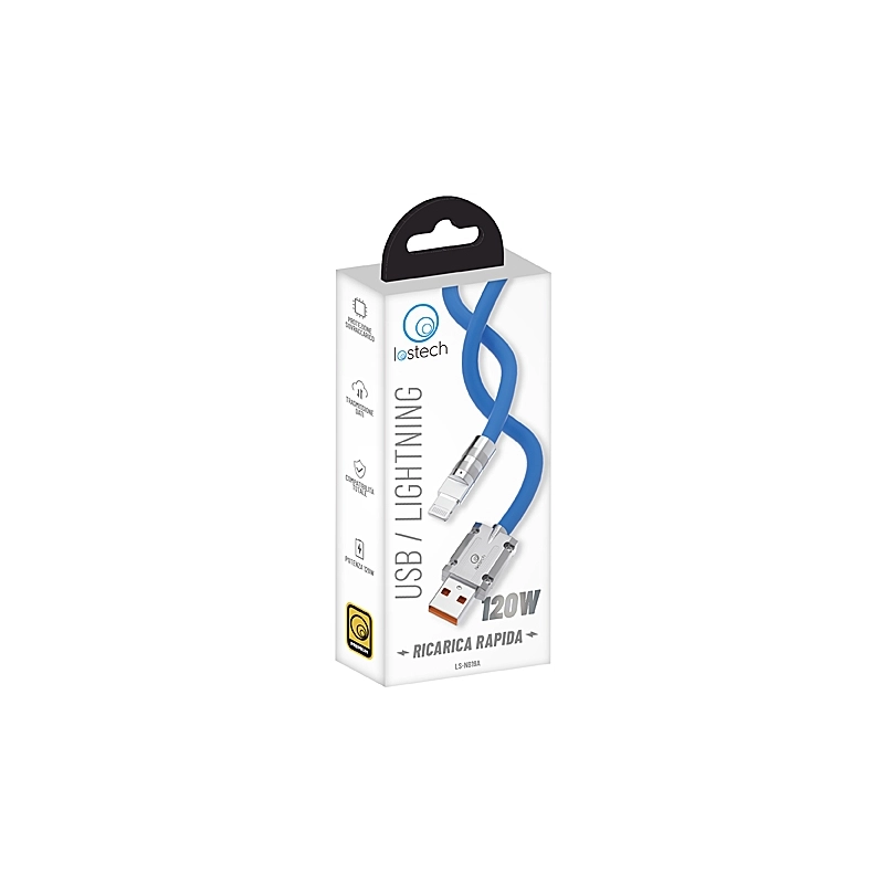 Cavo USB - Lightning. Ultra resistente con terminali in metallo. 120 Watt. Ricarica rapida. Protezione da sovraccarico. Lunghezza 150 cm. Colore cavo arancione.