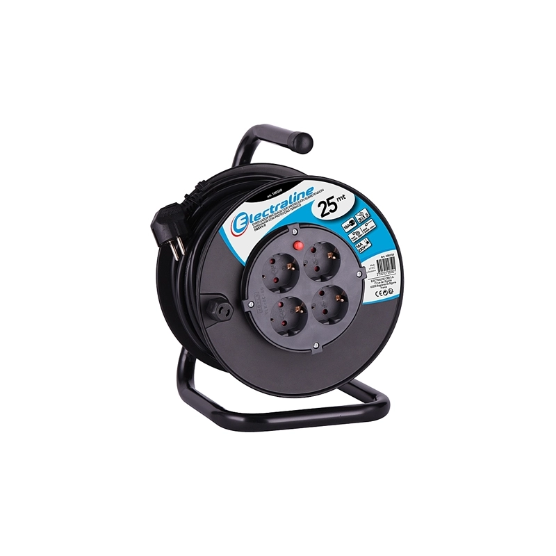Cavalletto in acciaio, tamburo in polipropilene. Spina Schuko 2P+T 16A. 4 prese Schuko 2P+T 16A. Cavo Sezione 3 x 1,50 mm2. Con disgiuntore. Modello = Lunghezza cavo m