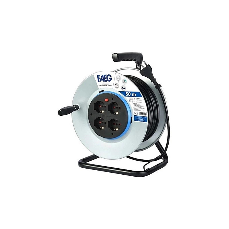 Avvolgicavo in metallo zincato con 4 prese bipasso schuko 10/16A. Spina da 16 A. IP20. Cavo HO5 VV-F sezione 3x1,5 mm2. Con maniglia pieghevole ergonomica per il riavvolgimento. Guidacavo inferiore sul cavalletto. Lunghezza 50 mt