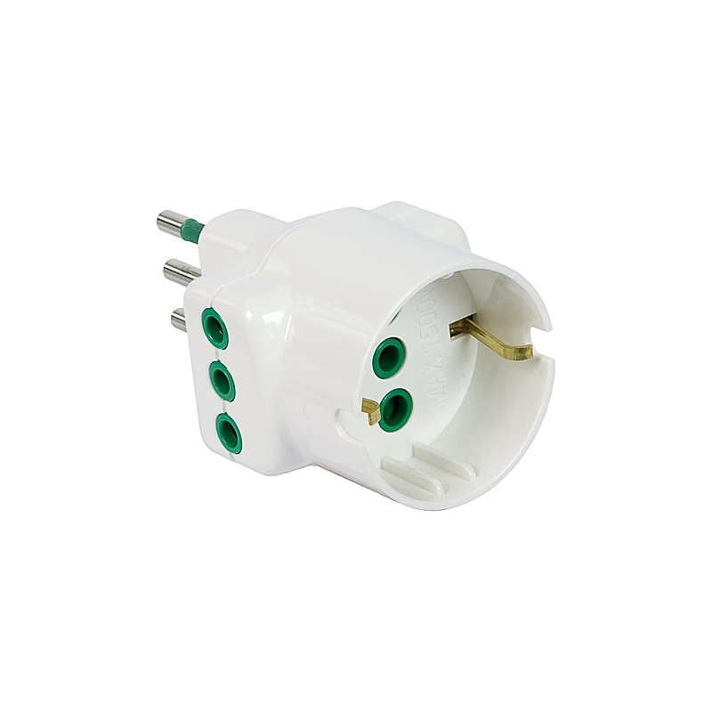 Adattatore triplo. Spina italiana 2P+T 10A. 2 prese italiane 2P+T 10 A, 1 presa Schuko 2P+T 16A. Colore bianco. Confezionamento sfuso, made in Italy.
