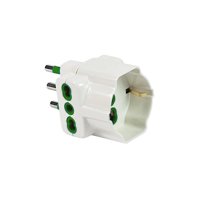 Adattatore triplo. Spina italiana 2P+T 16A. 2 prese bipasso italiane 2P+T 16 A, 1 presa bipasso Schuko 2P+T 16A. Colore bianco. Confezionamento sfuso, made in Italy.