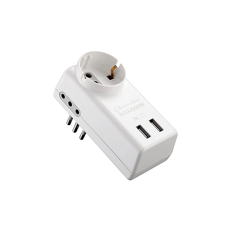 Adattatore con spina da 16A - 230V. Con 2 prese USB, 1 presa universale e 2 prese bivalenti. Colore bianco.