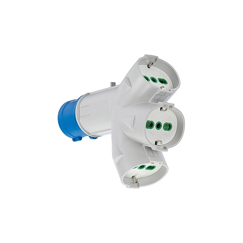 Adattatore industriale Triplex. Spina 2P+T 16A 200-250v. IP44. 3 prese bipasso/schuko 2P+T 16A.