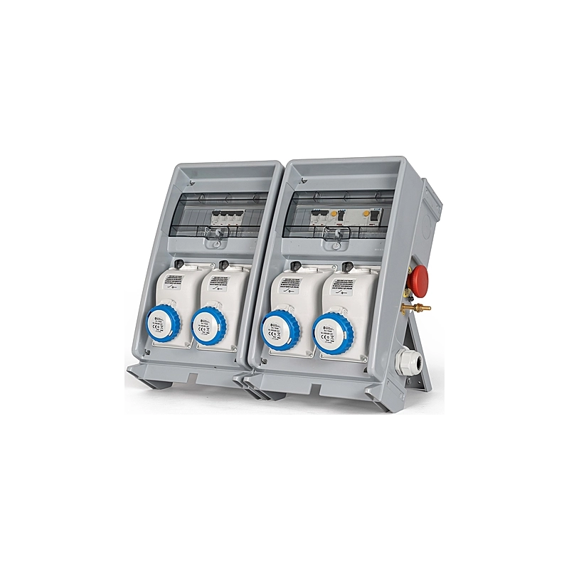 Quadro di distribuzione cantiere con prese interbloccate. Possibilita' di fissaggio a muro oppure utilizzabile in appoggio con supporto a scomparsa. Pulsante di emergenza laterale. Alimentazione tramite morsettiera. IP67. Dimensioni 516x435x185 mm. Interruttore magnetotermico da 32 A. 4 prese 2P+T 16 A 200-250 V.