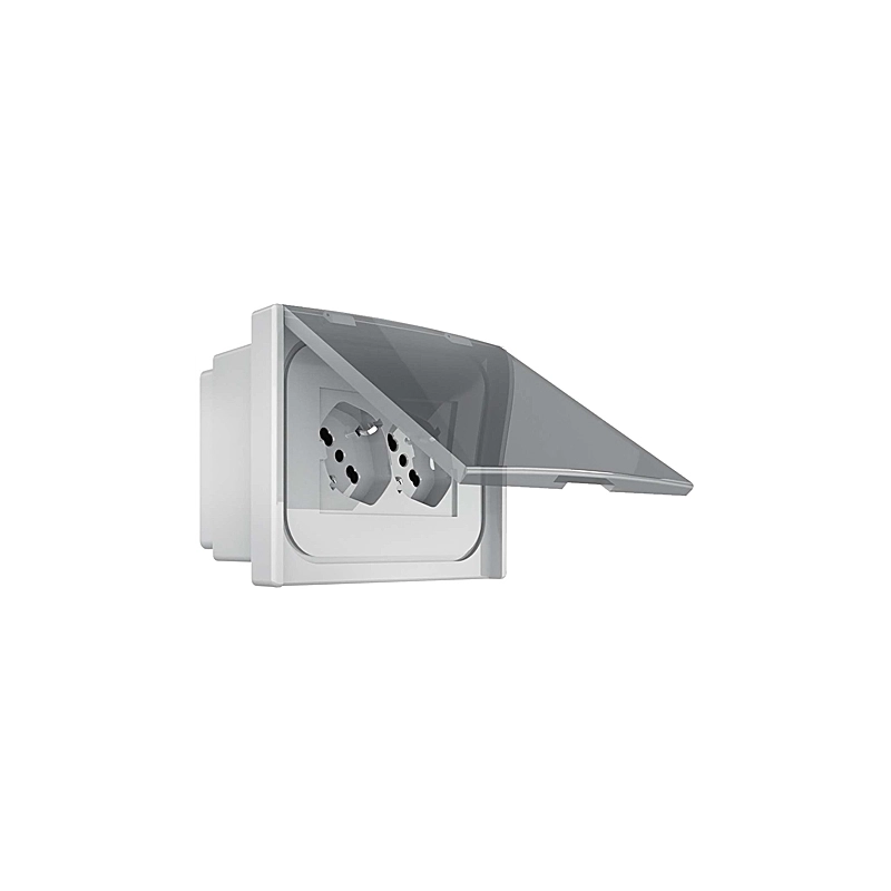 Multipresa universale da incasso OPERA. Doppia presa bipasso italo/tedesca 2P+T 16A. IP55. Precablata per scatola a 3 moduli. Colore grigio.