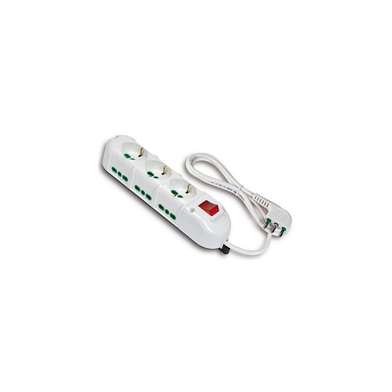 Lunghezza cavo m 1,5. Sezione cavo 3x1 mm2. 3 prese 2P+T 16A bipasso/Schuko + 6 prese 2P+T 16A bipasso. Spina 2P+T 16A. Interruttore luminoso