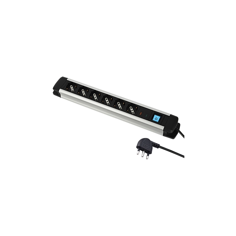 Multipresa a 6 posti (10/16A), spina 16A con interruttore di sicurezza on/off illuminato, con protezione da sovraccarico di tensione. Cavo da 2 mt, H05VV-F - 3G1.0 mm2. Con fori per fissaggio a muro.