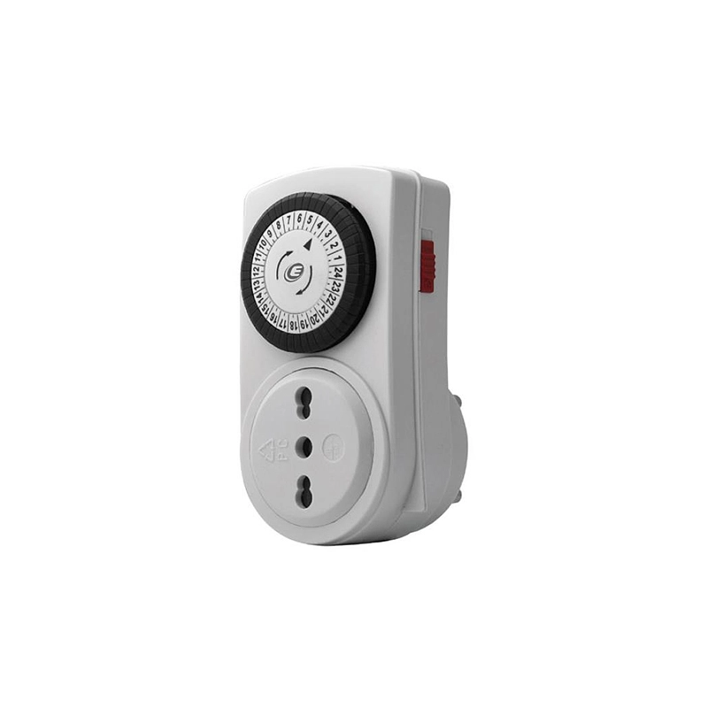 Mini timer giornaliero per interni. Carico massimo 16 A-3500 W. Tempo minimo di regolazione 30 minuti. Spina 16 A. In blister.