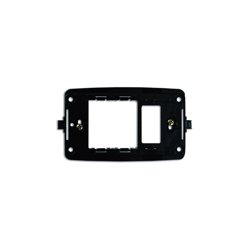Supporto per 1 presa schuko e 1 posto. In policarbonato. Colore nero. In blister.