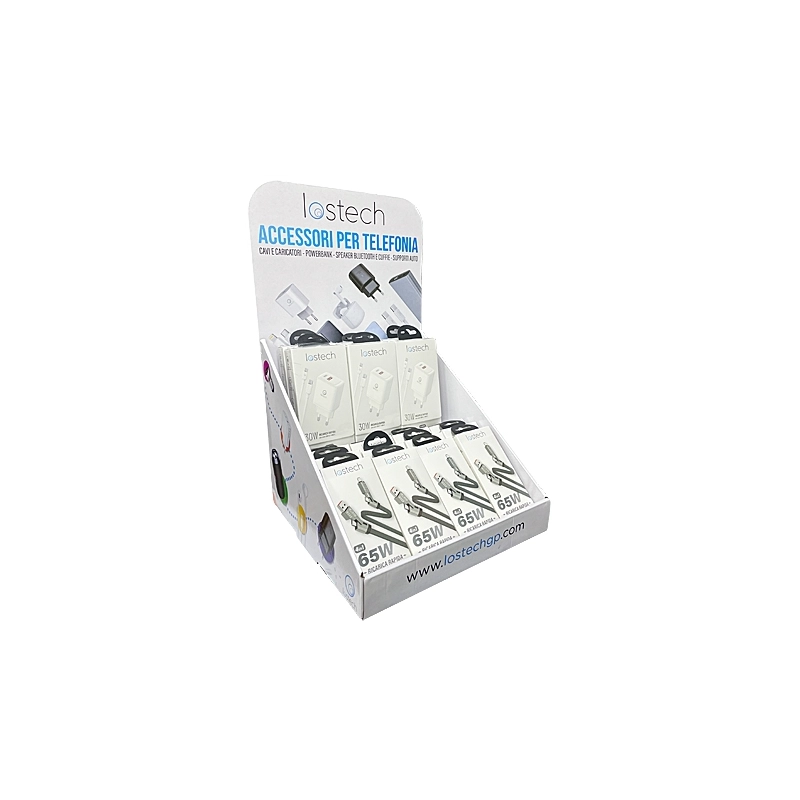 Espositore composto da 6 spine da 30 Watt con cavo type-c e 12 cavi multiconnettore 4 in 1