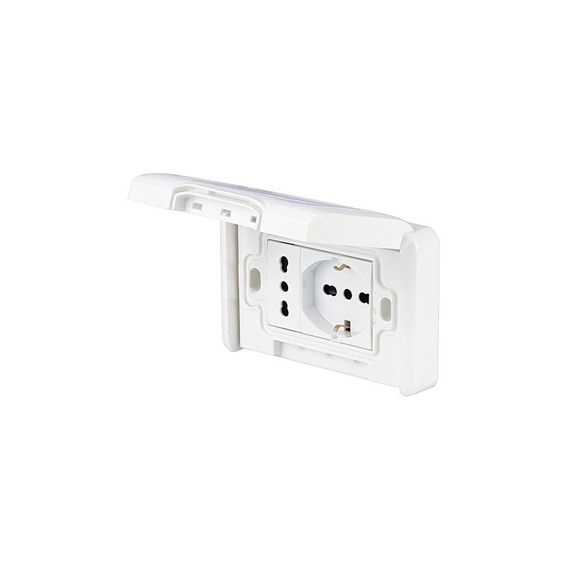Multipresa da incasso. Presa bipasso italo/tedesca 10/16A e schuko + presa bipasso 10/16A. Placca in tecnopolimero antiurto. Colore bianco. IP55: protezione contro le polveri e contro i getti d'acqua.