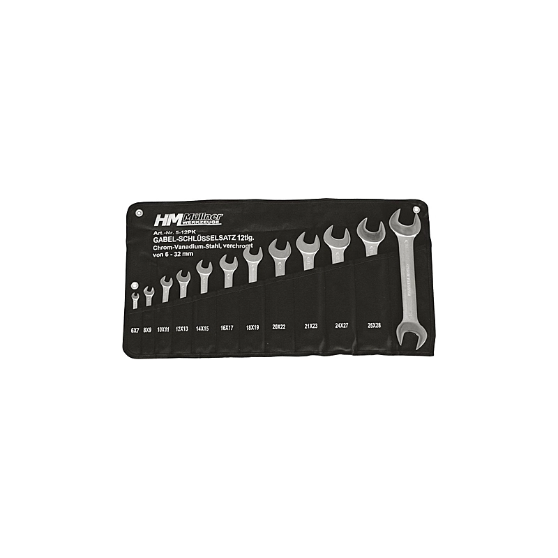 Set chiavi a forchetta da 12 pezzi. Da 6 a 32 mm. In acciaio al cromo vanadio, teste cromate lucide. In busta di tela.