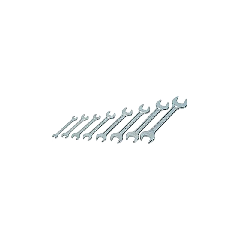 Serie 8 pezzi chiave a forchetta in acciaio al cromo vanadio, cromato. Confezionate in scatola cartone con finestra. Misura 6-22 mm.