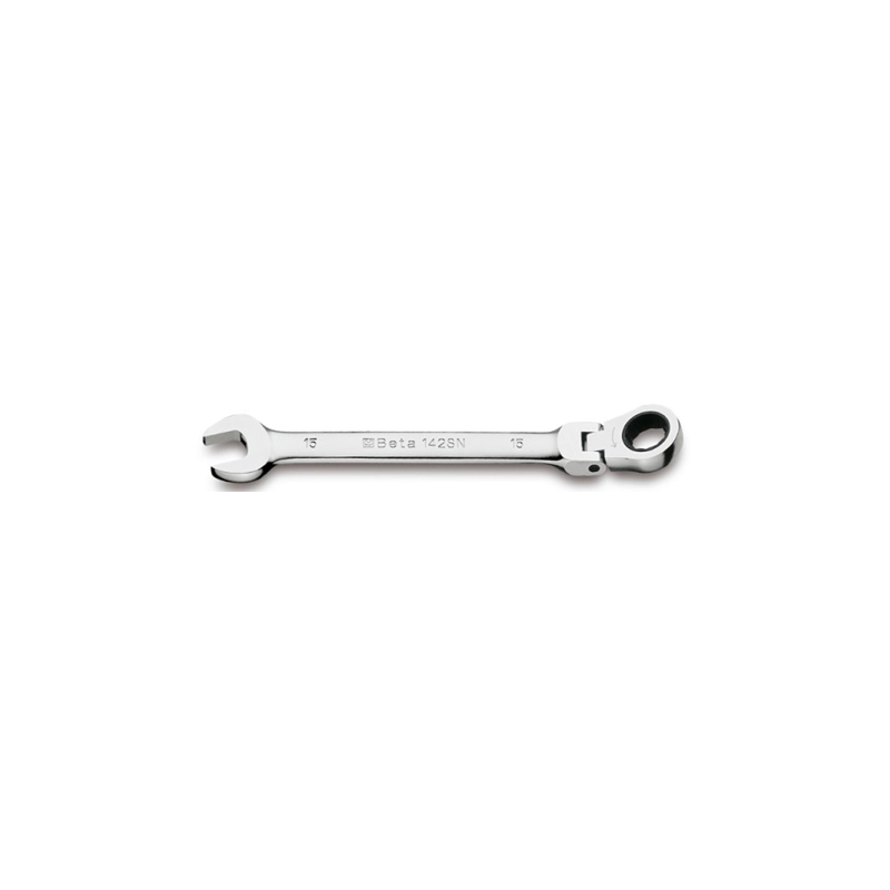 Chiavi combiante a forchetta e poligonale diritte a cricchetto snodate cromate. Testa piegata di 15 gradi. Testa snodata a 180 gradi. Modello = misura mm