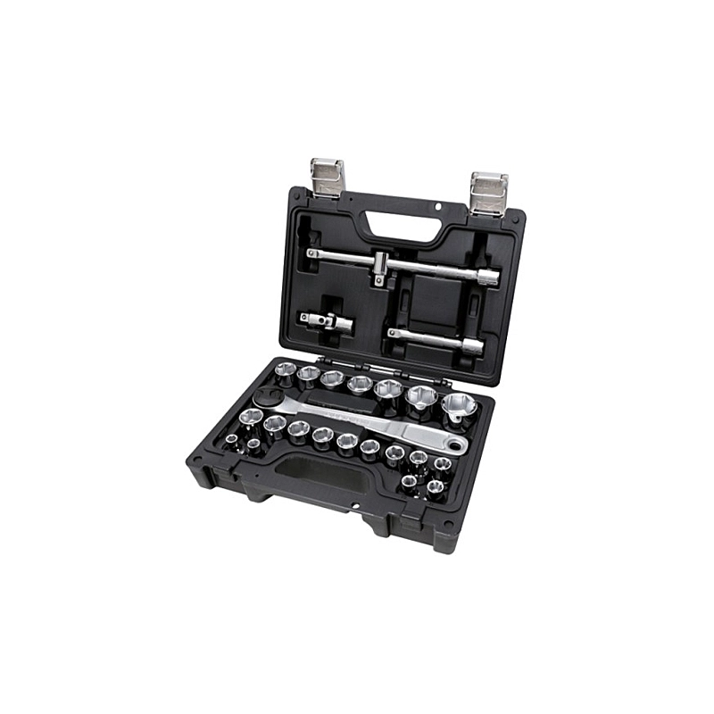 Assortimento di 20 chiavi a bussola esagonali da 1/2' 8-32 mm e 5 accessori. In cassetta di plastica.